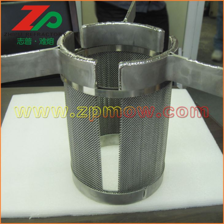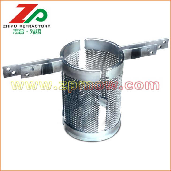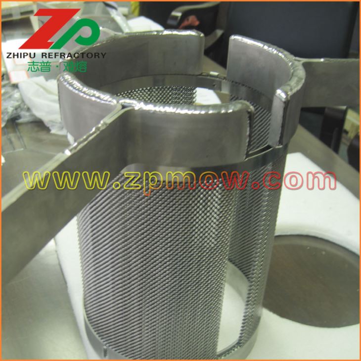 發(fā)熱體一般采用鳥籠結(jié)構(gòu)鎢發(fā)熱體或者鎢絲網(wǎng)發(fā)熱體,有利于提供均勻穩(wěn)定的溫場。 鎢絲網(wǎng)發(fā)熱體組件做為藍(lán)寶石晶體生長爐內(nèi)的熱源,對鎢坩堝內(nèi)的熔液形成湍流、產(chǎn)生徑向溫度梯度具有決定性的作用。因此,具有高純度、高密度、制作精良、設(shè)計合理的鎢絲網(wǎng)發(fā)熱體組件對藍(lán)寶石晶體的質(zhì)量控制,節(jié)約能源以及使用壽命具有重要意義。