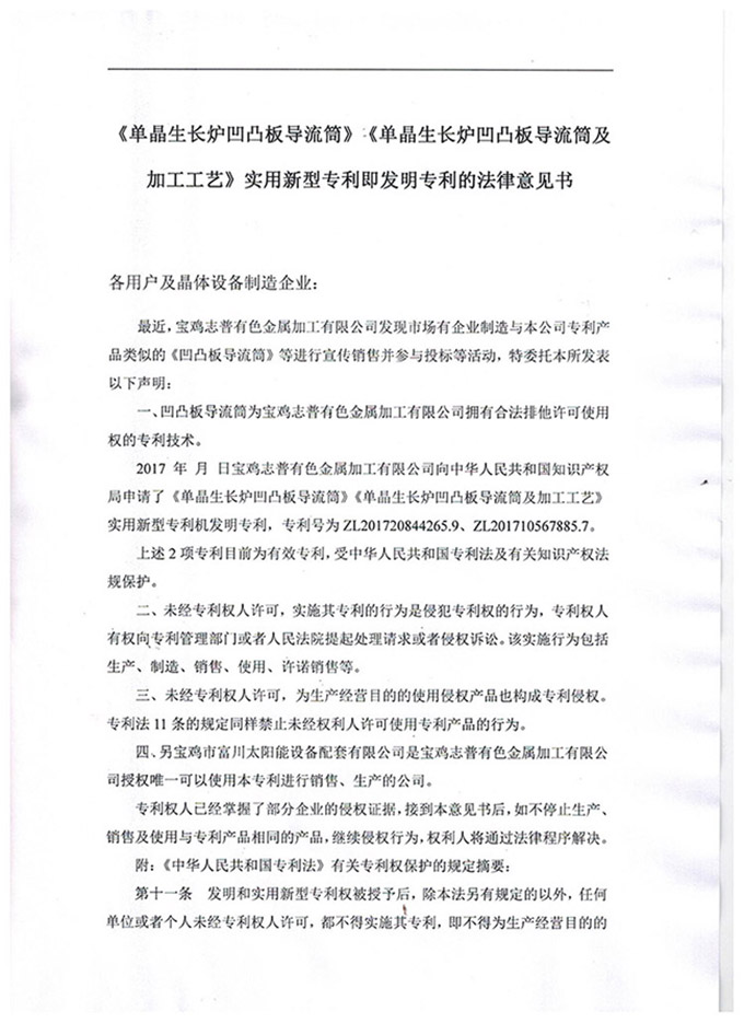 《單晶生長爐凹凸板導(dǎo)流筒》發(fā)明專利的法律意見書